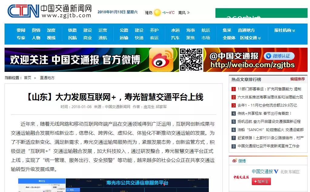 近日,由環(huán)球軟件研發(fā)并投入使用的壽光市智慧交通平臺(tái)在壽光交通運(yùn)輸局正式上線。平臺(tái)憑借安全、準(zhǔn)確、高效的管理模塊和便捷的公眾出行功能引起了行業(yè)內(nèi)多家媒體的高度關(guān)注,其中,中國(guó)交通新聞網(wǎng)在“直通地方”板塊發(fā)文《【山東】大力發(fā)展互聯(lián)網(wǎng)+,壽光智慧交通平臺(tái)上線》,詳細(xì)介紹了壽光智慧交通平臺(tái)的上線實(shí)施情況,具體報(bào)道如下: