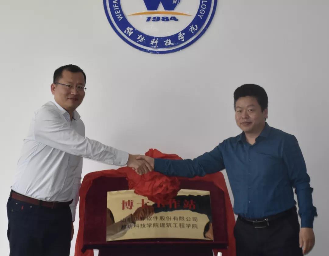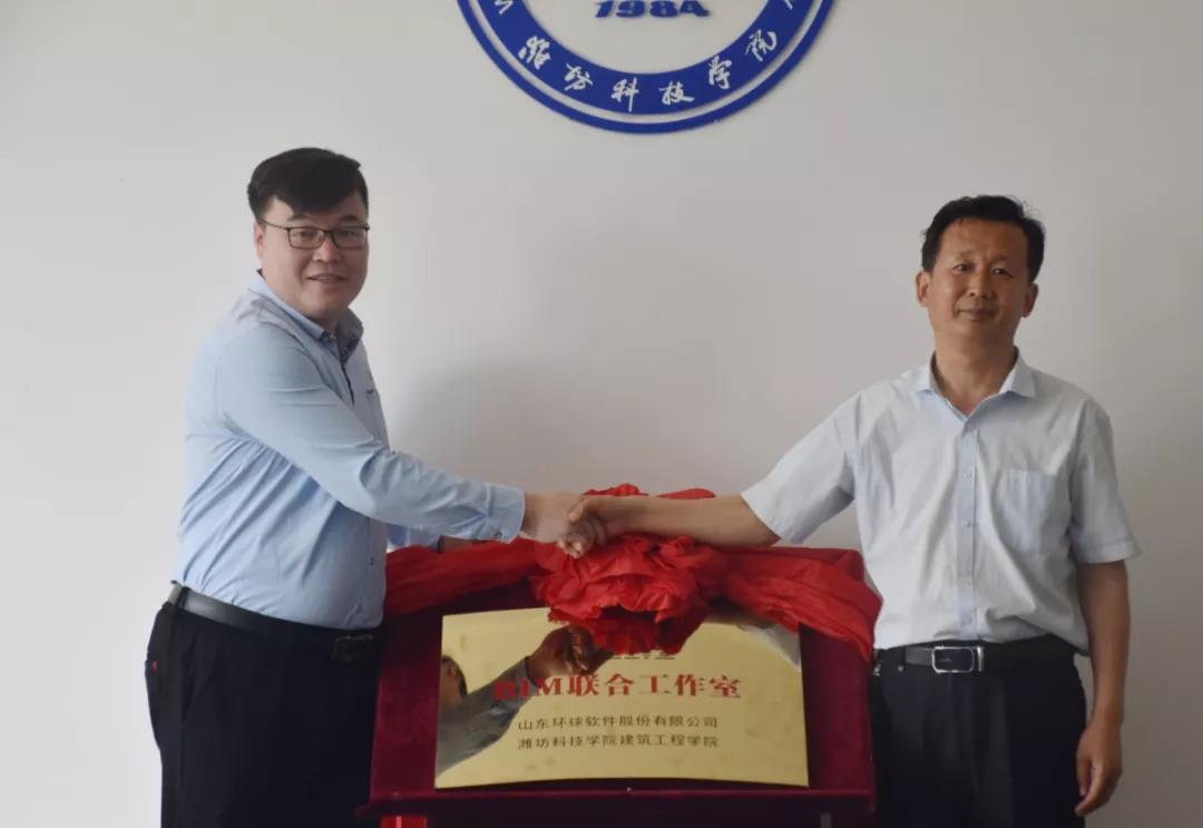濰坊科技學(xué)院副院長(zhǎng)寇興亭與環(huán)球軟件聯(lián)席總裁張立偉為“BIM聯(lián)合工作室”揭牌