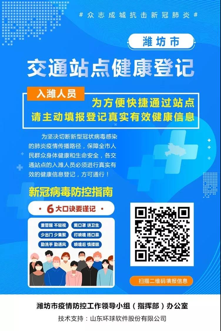 濰坊市疫情防控工作指揮部委托環(huán)球軟件研發(fā)了交通站點(diǎn)健康登記系統(tǒng),入濰人員掃描二維碼,進(jìn)入系統(tǒng)填寫個人健康信息,進(jìn)一步加強(qiáng)入濰人員管理,有效配合相關(guān)部門進(jìn)行防疫檢查,方便人員安全出行,減少交叉感染風(fēng)險。