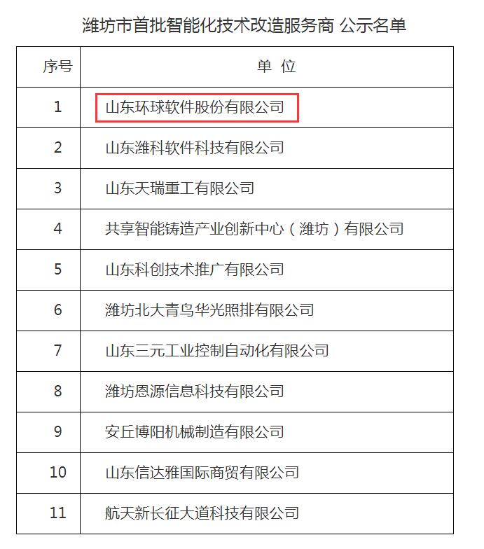 2020年12月3日,濰坊市工業(yè)和信息化局發(fā)布“關(guān)于擬認(rèn)定濰坊市首批智能化技術(shù)改造服務(wù)商的公示”名單,環(huán)球軟件被認(rèn)定為濰坊市首批智能化技術(shù)改造服務(wù)商。