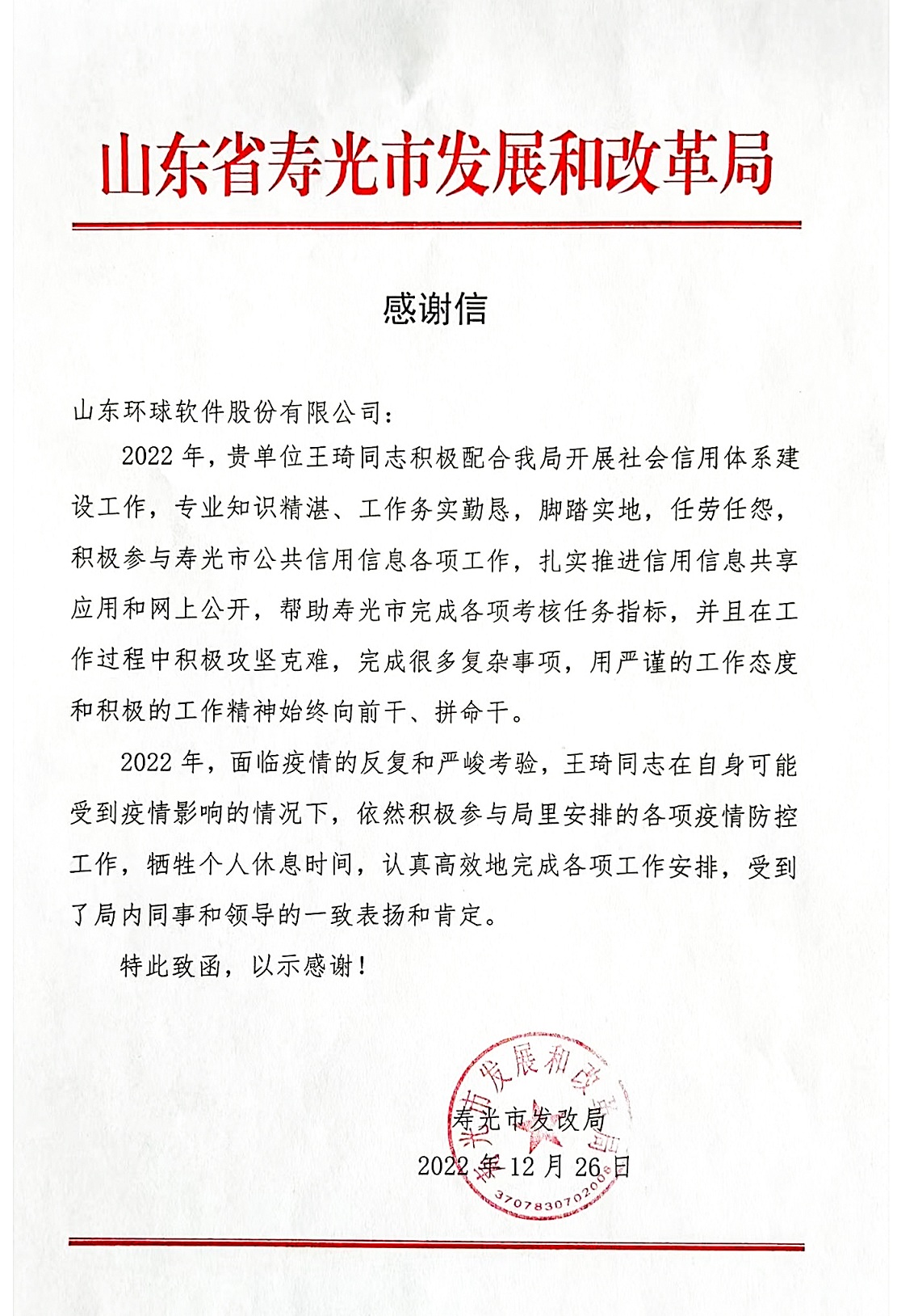 近日,環(huán)球軟件收到市發(fā)改局的感謝信,對環(huán)球軟件在開展社會(huì)信用體系建設(shè)工作上提供信息化保障服務(wù)表示感謝。