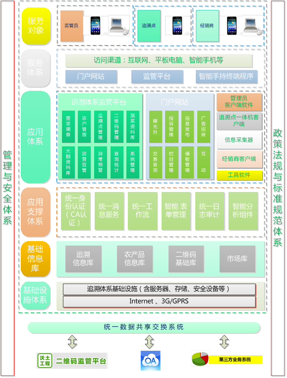 農(nóng)產(chǎn)品質(zhì)量安全追溯系統(tǒng)以“農(nóng)產(chǎn)品庫(kù)”為溯源核心,以“市場(chǎng)庫(kù)”為指導(dǎo),以“追溯信息庫(kù)”、“農(nóng)產(chǎn)品庫(kù)”、“二維碼基礎(chǔ)庫(kù)”、“市場(chǎng)庫(kù)”四大信息庫(kù)為支持,建立起農(nóng)產(chǎn)品從“組織認(rèn)證、產(chǎn)地準(zhǔn)出、市場(chǎng)準(zhǔn)入、全程追溯”的良性環(huán)境。使農(nóng)產(chǎn)品質(zhì)量暴露在市場(chǎng)監(jiān)管下,可依靠監(jiān)管的力量使農(nóng)產(chǎn)品質(zhì)量信譽(yù)發(fā)揮到最大的市場(chǎng)作用,真正實(shí)現(xiàn)農(nóng)產(chǎn)品質(zhì)量安全可追溯,有效保障百姓餐桌安全。
