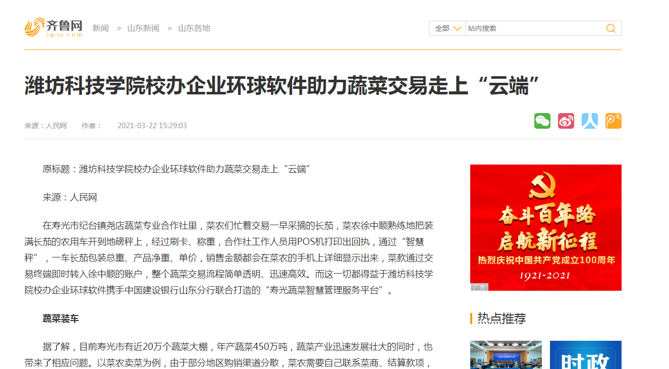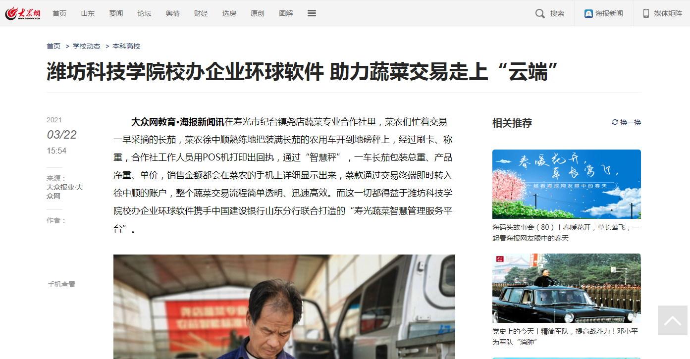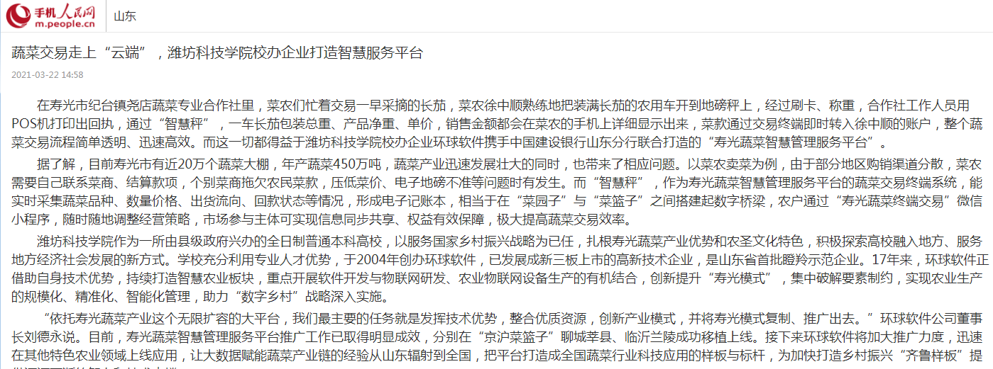 【人民網(wǎng)】【大眾網(wǎng)】【齊魯網(wǎng)】濰坊科技學(xué)院校辦企業(yè)環(huán)球軟件助力蔬菜交易走上“云端”