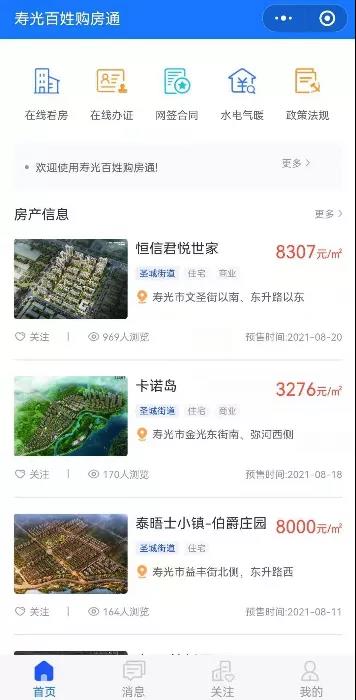 壽光“百姓購房通”系統(tǒng)主要包含在線看房、在線辦證、網簽合同、水電氣暖繳費、政策流程查詢等五大模塊。