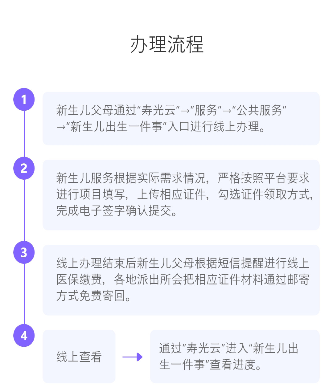 壽光市還推出“新生兒出生一件事掌上辦”服務(wù),充分利用移動互聯(lián)網(wǎng)、大數(shù)據(jù)等技術(shù),開發(fā)建設(shè)新生兒出生一件事便民應(yīng)用,統(tǒng)一使用“壽光云”APP作為統(tǒng)一入口,群眾僅需通過手機在“壽光云”設(shè)置“一件事”專欄里提報申請,按步驟操作即可辦理落戶、參保登記、參保繳費“一件事”。通過實施壽光市新生兒出生一件事一次辦好改革,讓群眾眼中繁瑣頭疼的“一件事”最快僅需2小時就能完成,所有證件辦理過程僅需1至2個工作日,全過程均免費,真正實現(xiàn)“讓數(shù)據(jù)多跑路,讓群眾不跑腿”。