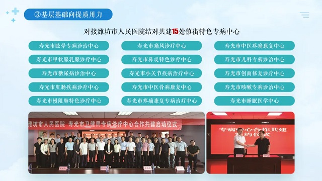 最后,基層基礎向提質用力。大力實施醫(yī)療衛(wèi)生強基工程和名醫(yī)、名科、名院“三名”工程建設,深入開展“優(yōu)質服務基層行”活動,有8處衛(wèi)生院達到推薦標準、7處衛(wèi)生院參照二級醫(yī)院管理,建成縣域醫(yī)療服務次中心4處,圣城街道衛(wèi)生院入選“省中醫(yī)特色衛(wèi)生院”,成功創(chuàng)建為國家級糖尿病規(guī)范化管理“三星門診”。累計投入9000多萬元大力更新診療設備,衛(wèi)生院全部配備CT、4處配有核磁共振,與濰坊市人民醫(yī)院共建15處基層專病中心,建成市級基層特色???8個,滿足了群眾“小病不出村、常見病不出縣”的就醫(yī)需求。
