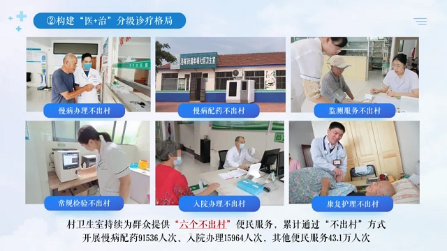 其次,構建“醫(yī)+治”分級診療格局。充分發(fā)揮衛(wèi)生院作為單病種群體管理工作的延伸作用,由全科醫(yī)師負責首診患者和協(xié)調會診,縣級醫(yī)院負責質控指導和雙向轉診,持續(xù)為基層群眾提供慢病管理、監(jiān)測服務、常規(guī)檢驗、康復護理等“六個不出村”服務。目前,通過“不出村”方式為群眾開展各類健康服務54.1萬人次,并將28.6萬人納入單病種群體管理,實現(xiàn)了專業(yè)醫(yī)療資源和鎮(zhèn)村醫(yī)療機構的無縫銜接。