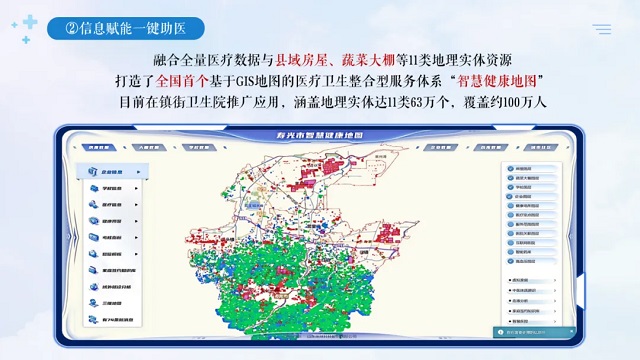 其次,信息賦能一鍵助醫(yī)。依托“數(shù)字健康大腦”,開發(fā)建設了互聯(lián)網醫(yī)院、智慧藥房、分娩人臉識別等25項子系統(tǒng),實現(xiàn)了相關檢查信息互通、檢查結果互認、遠程會診協(xié)作。借助DeepSeek模型動態(tài)整合居民健康數(shù)據,陸續(xù)推出AI動態(tài)心電、AI互聯(lián)網問診、AI輔助診斷等模塊,成功上線智能醫(yī)護助手。系統(tǒng)整合全量醫(yī)療數(shù)據與縣域房屋、蔬菜大棚等11類地理實體資源,打造了全國首個基于GIS地圖的醫(yī)療衛(wèi)生整合型服務體系“智慧健康地圖”,相關做法被國家衛(wèi)健委、省衛(wèi)健委發(fā)文推廣。