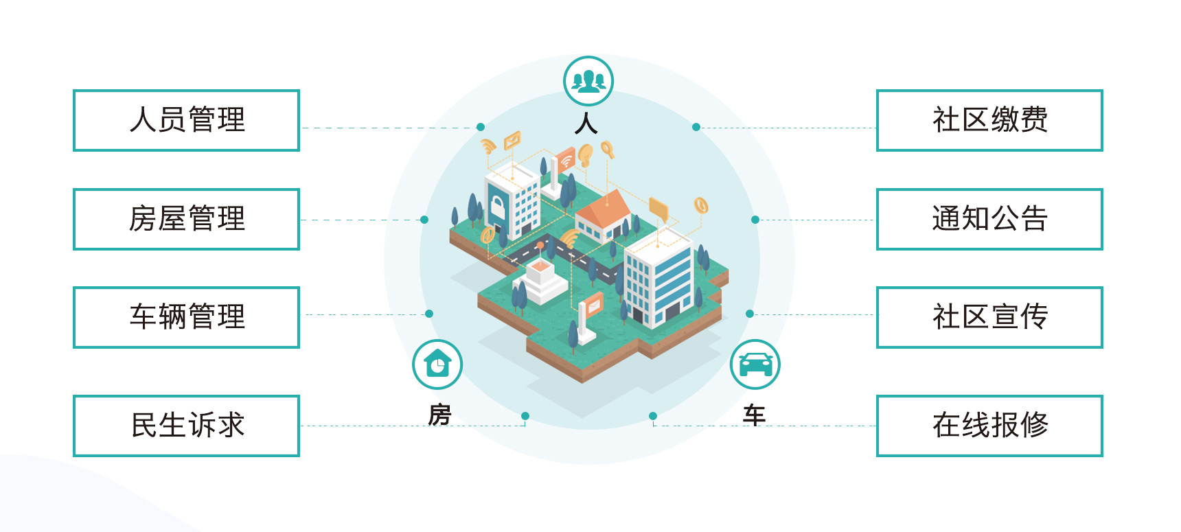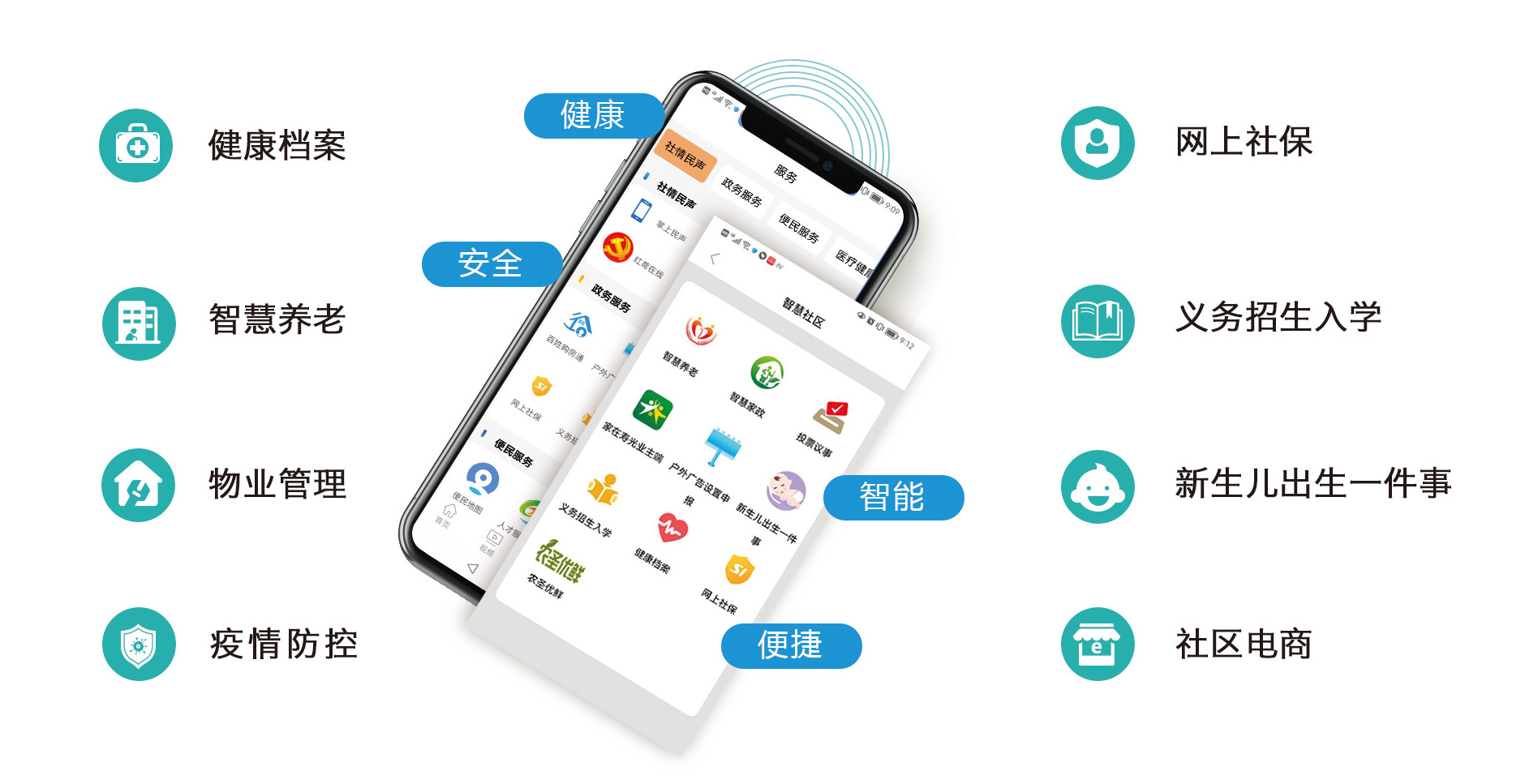 結(jié)合社區(qū)智能硬件建設(shè),為居民提供“政務(wù)服務(wù)+社區(qū)安防+物業(yè)管理+便民服務(wù)”的一體化智慧社區(qū)綜合應(yīng)用
