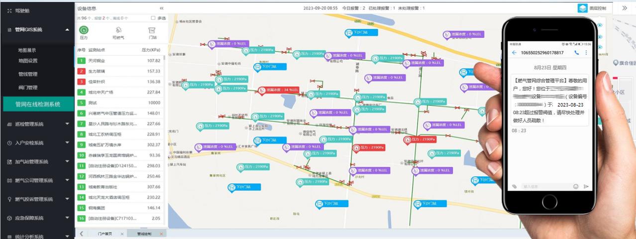 基于互聯(lián)網(wǎng)技術(shù),將分散在各地的管網(wǎng)監(jiān)測點(diǎn)的數(shù)據(jù)(管網(wǎng)壓力、氣體泄露濃度等)實(shí)時(shí)傳送到監(jiān)控中心,形成以監(jiān)控中心為核心輻射整個(gè)管網(wǎng)的分布式監(jiān)控網(wǎng)絡(luò),使在線監(jiān)測不存在盲區(qū)。指標(biāo)出現(xiàn)異常時(shí)自動發(fā)送報(bào)警短信,將安全隱患撲滅在萌芽狀態(tài)。