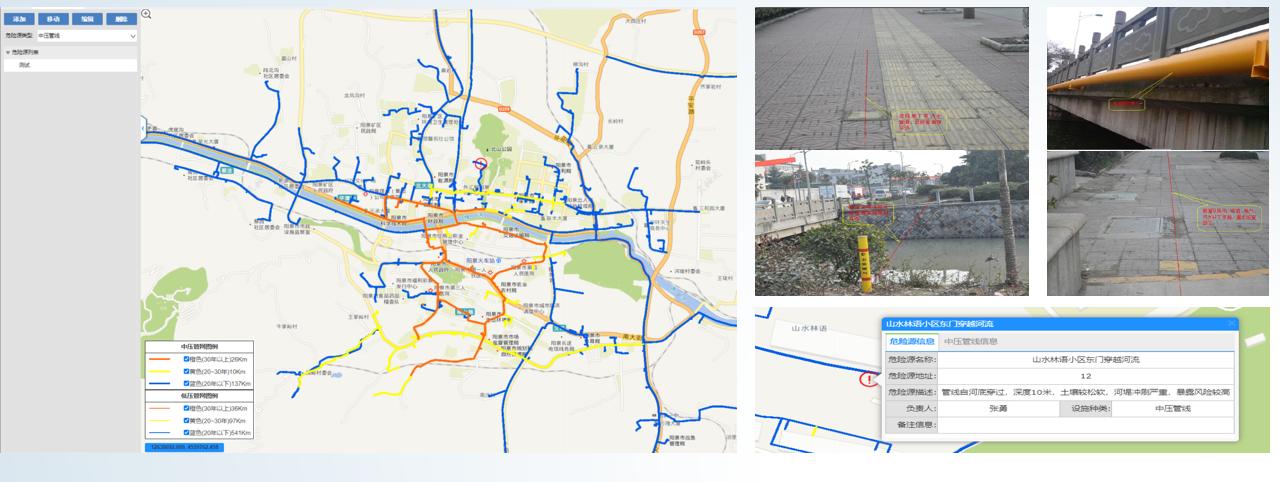 一張圖顯示管網(wǎng)、監(jiān)測設(shè)備、巡檢人員、存在隱患情況、 施工情況等信息,隨時(shí)抽查巡檢數(shù)據(jù),提高巡檢質(zhì)量。